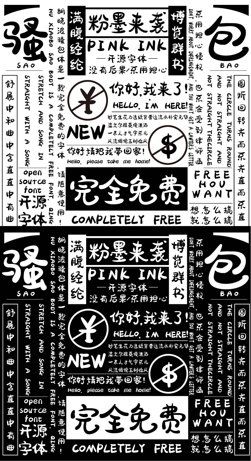 胡晓波骚包体版权均属于胡晓波工作室,已在国家版权局登记认证。胡晓波男神体命名非常骚气,完全符合胡晓波的性格。 使用范畴说明:允许任何个人和企业免费使用,包括商用用途。但不得单独或者附带地以出售、出租、出借等方式向公众发行以获取利益。同时不得对本字库软件进行修改、仿制、反编译、转换、拆分。 重点再强调三遍,永久免费商业使用! 永久免费商业使用! 永久免费商业使用!