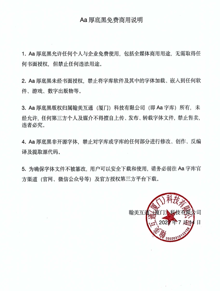 Aa厚底黑由Aa字库在其公众号上首发,声明免费并提供了免费商用说明。